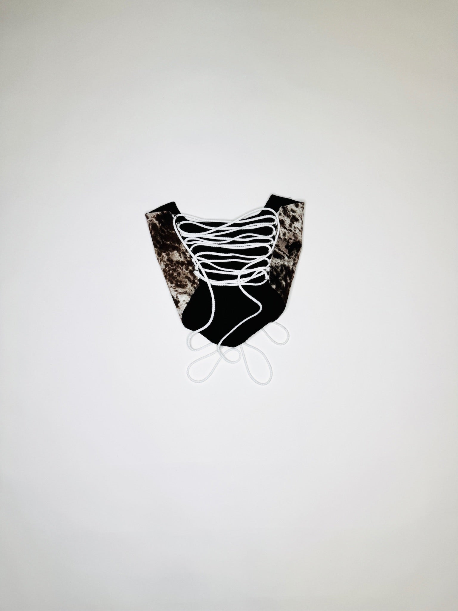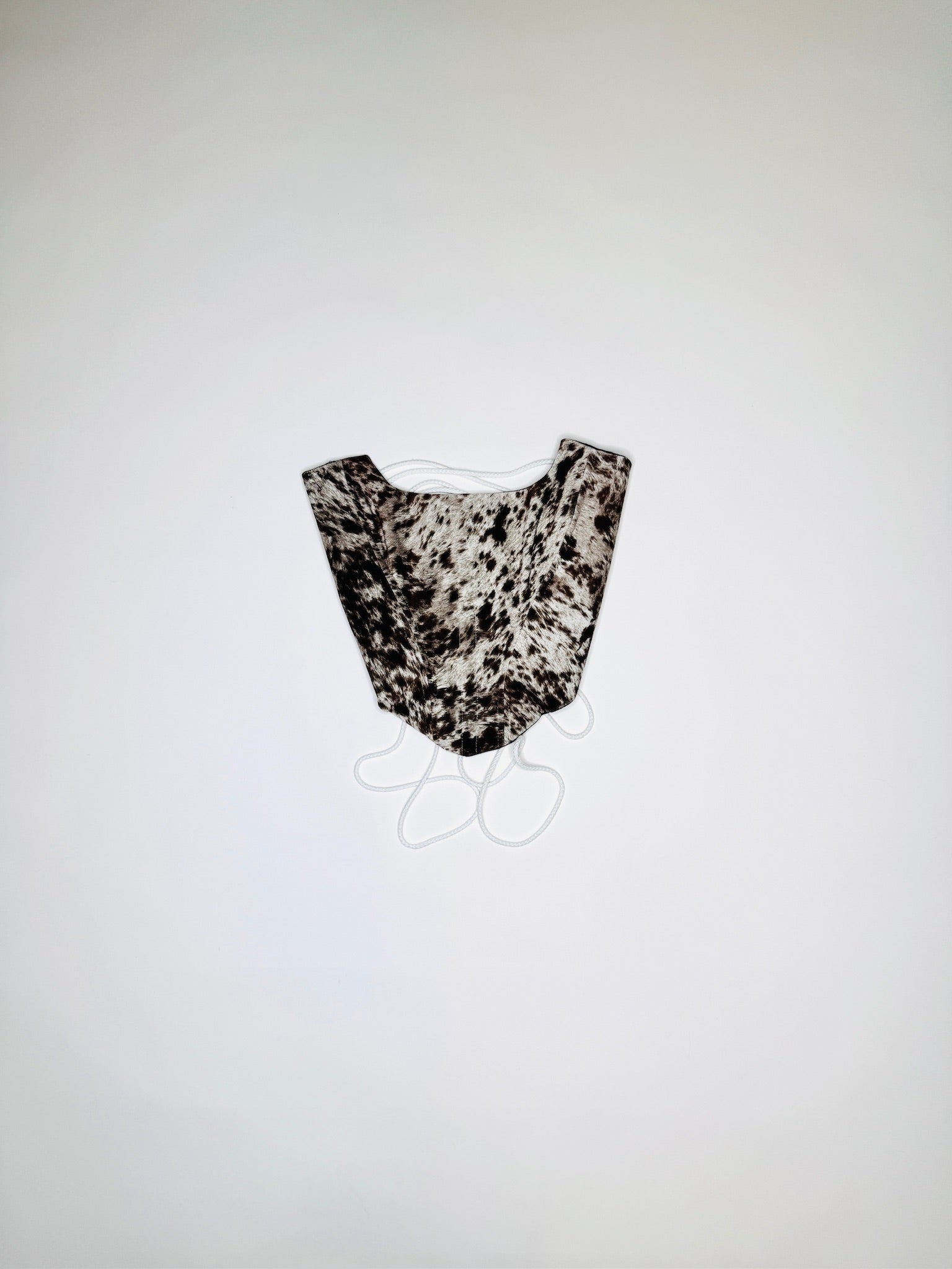 One-of-a-kind brown splattered cow print corset. Handmade with 100% Linen lining. Back lace-up rope closures adjustable from sizes XS - Medium.