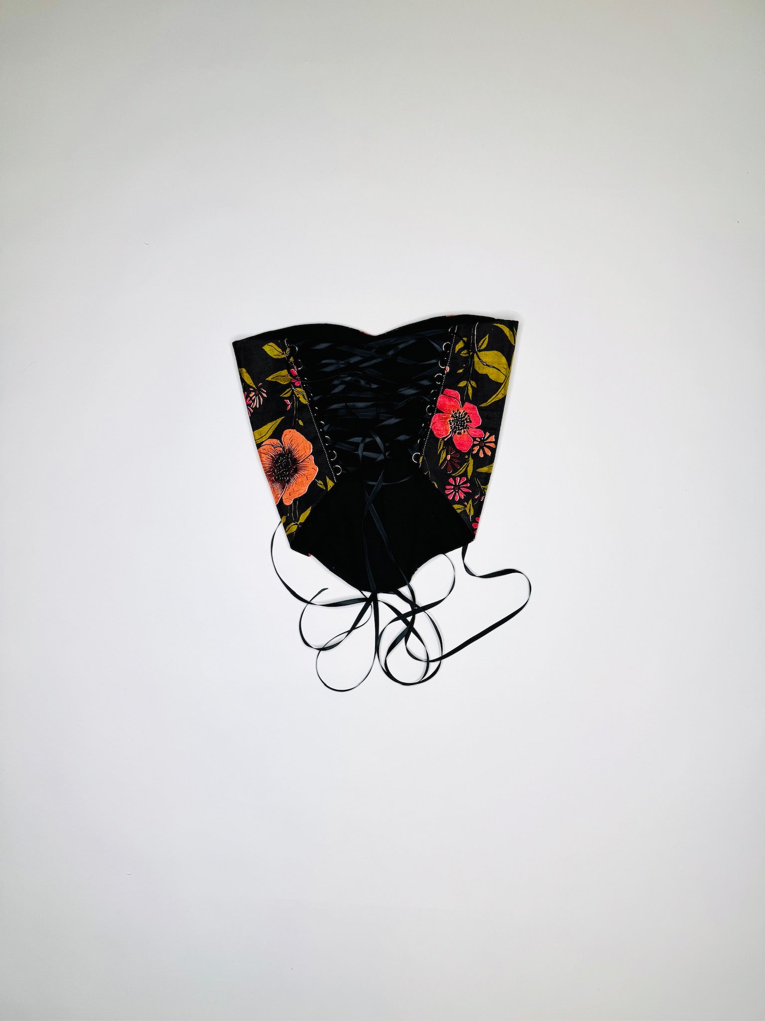 One-of-a-kind brown and pink floral print corset. Handmade with 100% Linen lining. Back lace-up ribbon closures adjustable from sizes XS - Medium.