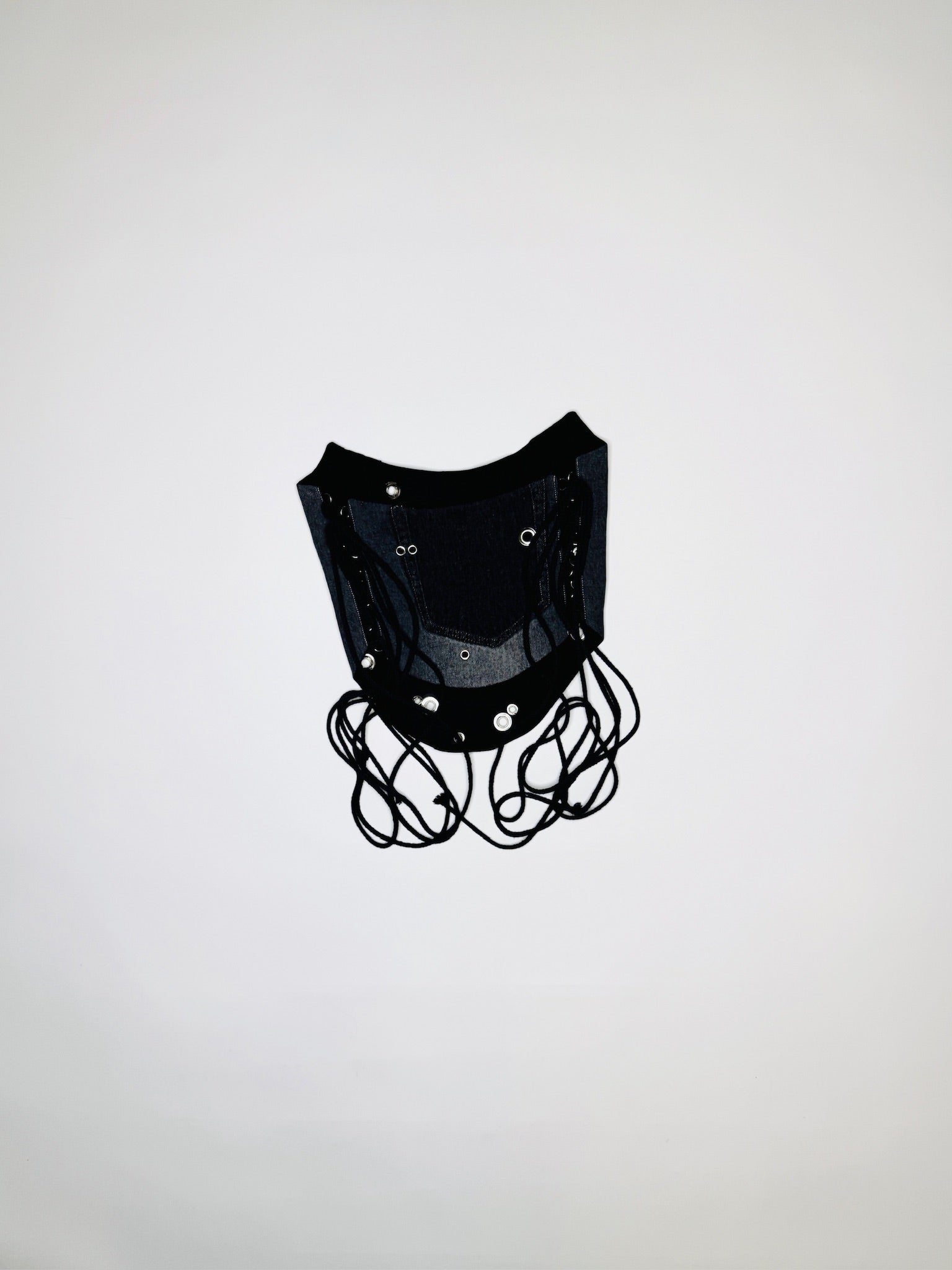 One-of-a-kind pierced grey denim corset. Handmade with 100% Linen lining. Side lace-up rope closures adjustable from sizes XS - Medium.