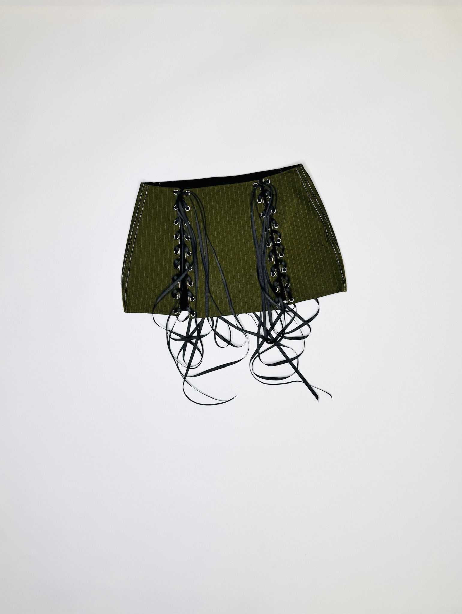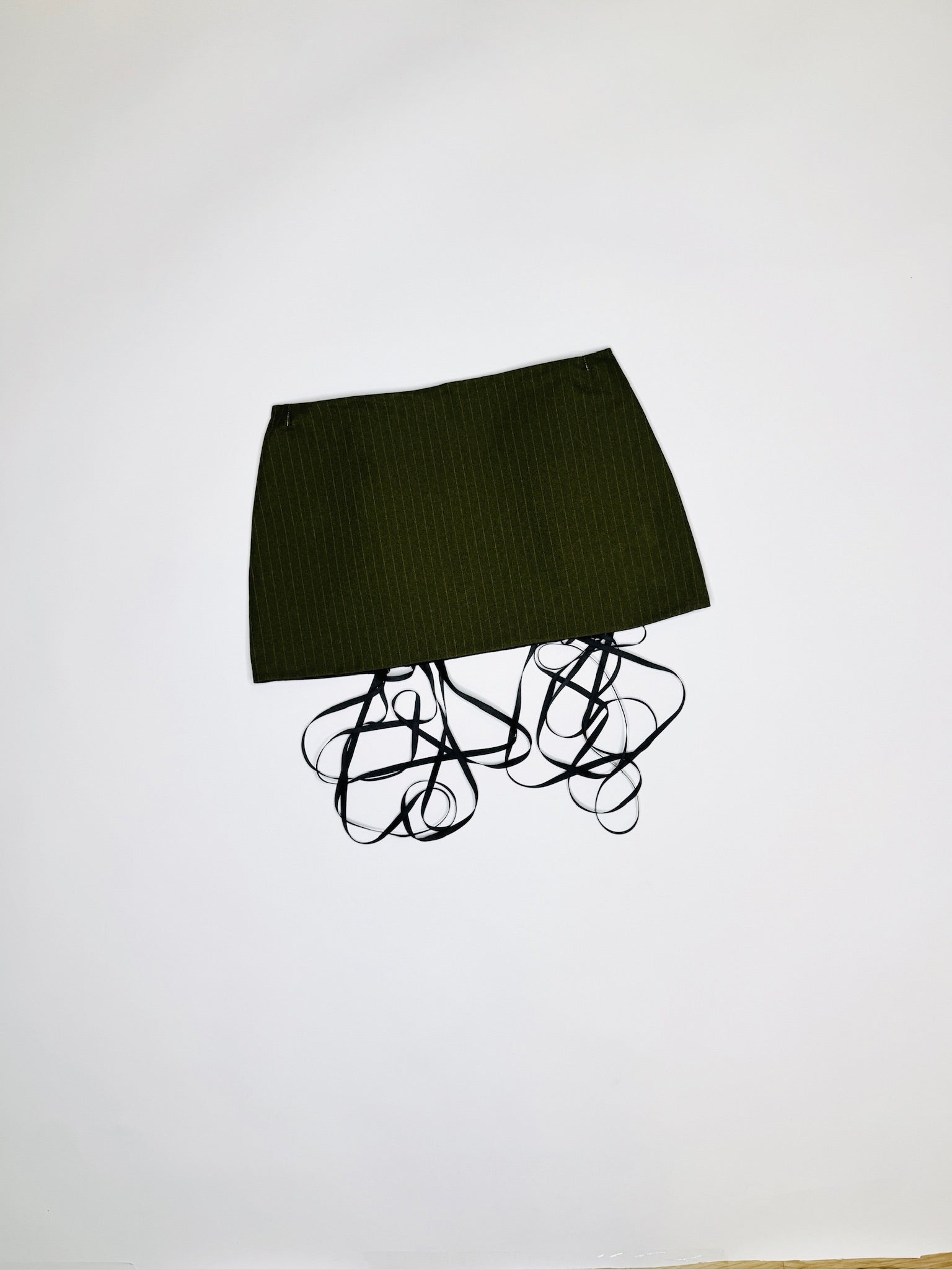 One-of-a-kind green pinstripe print skirt. Double front lace-up ribbon closure adjustable from sizes XS - Medium.