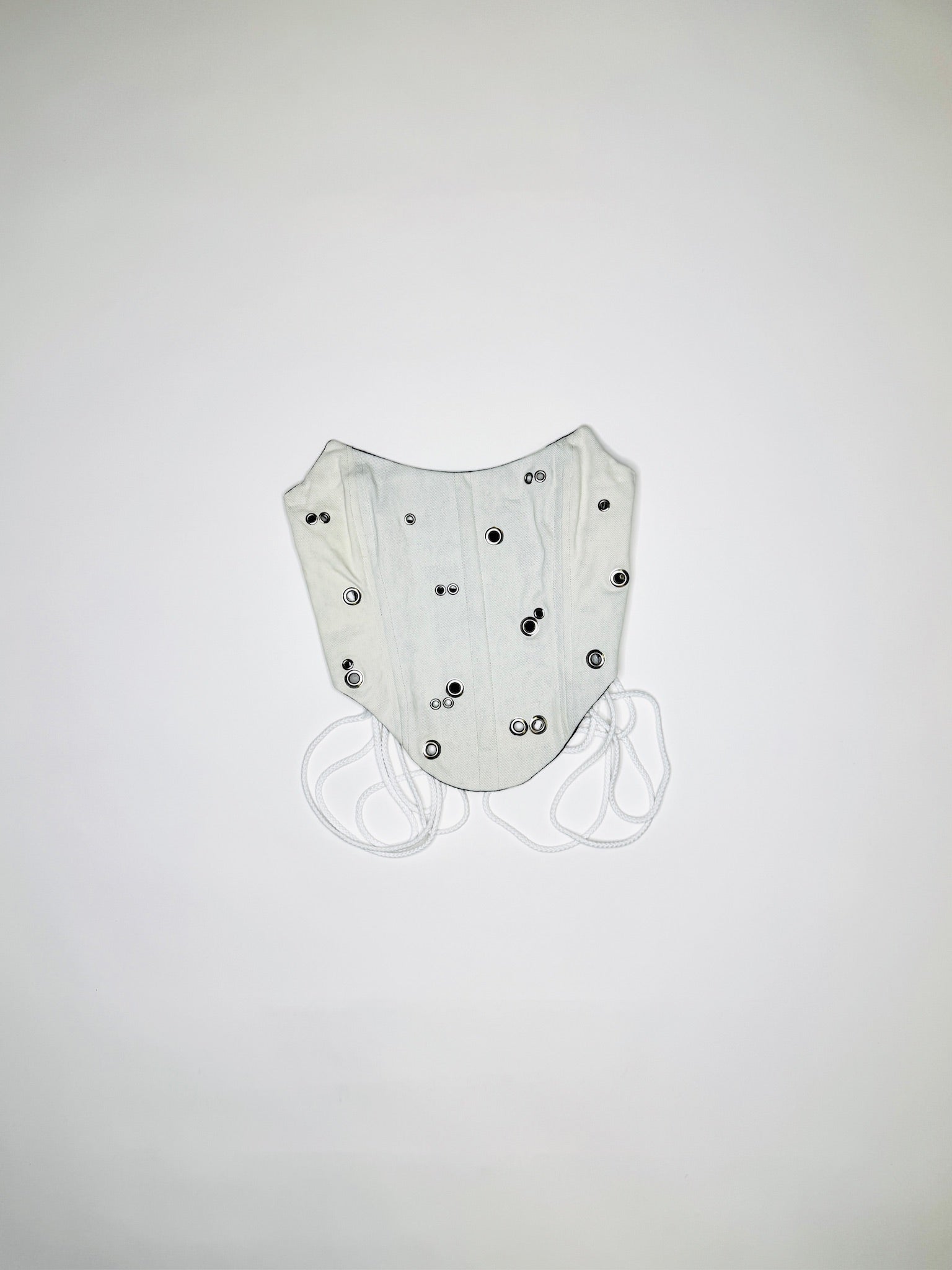One-of-a-kind pierced light blue denim corset. Handmade with 100% Linen lining. Side lace-up rope closures adjustable from sizes XS - Medium.