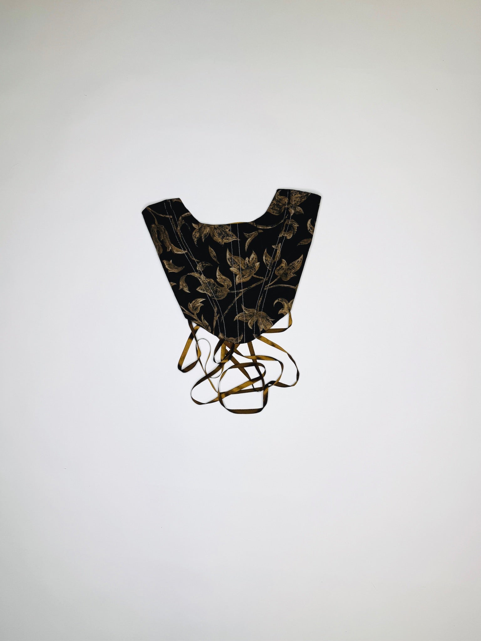 One-of-a-kind black and gold print corset. Handmade with 100% Linen lining. Back lace-up rope closures adjustable from sizes XS - Medium.