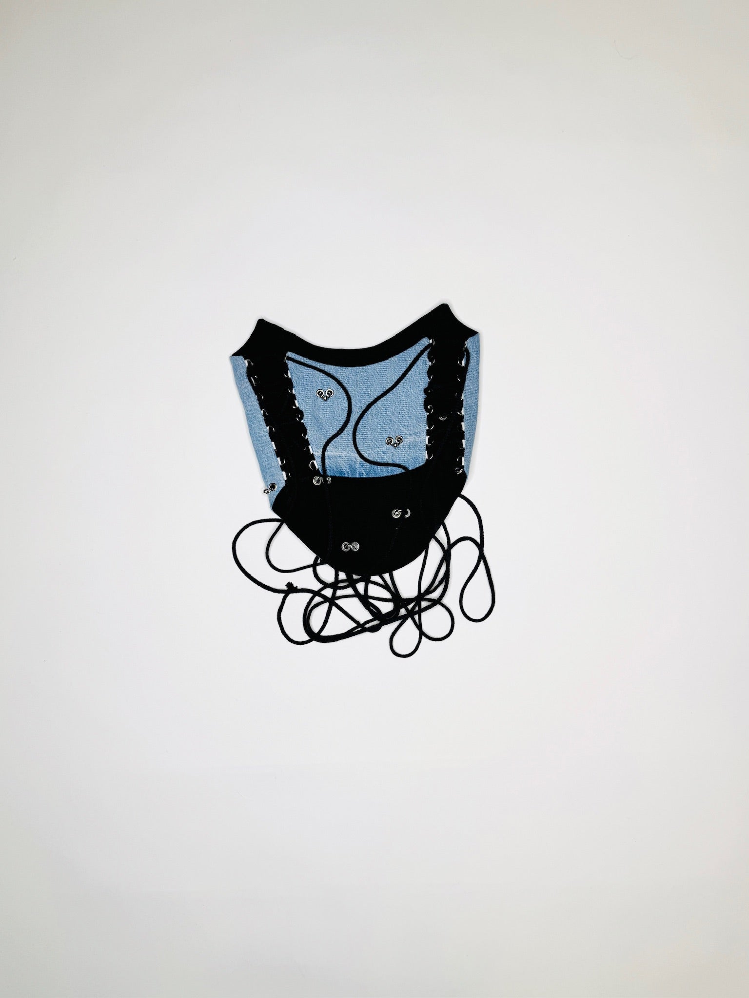 One-of-a-kind pierced light blue denim corset. Handmade with 100% Linen lining. Side lace-up rope closures adjustable from sizes XS - Medium.