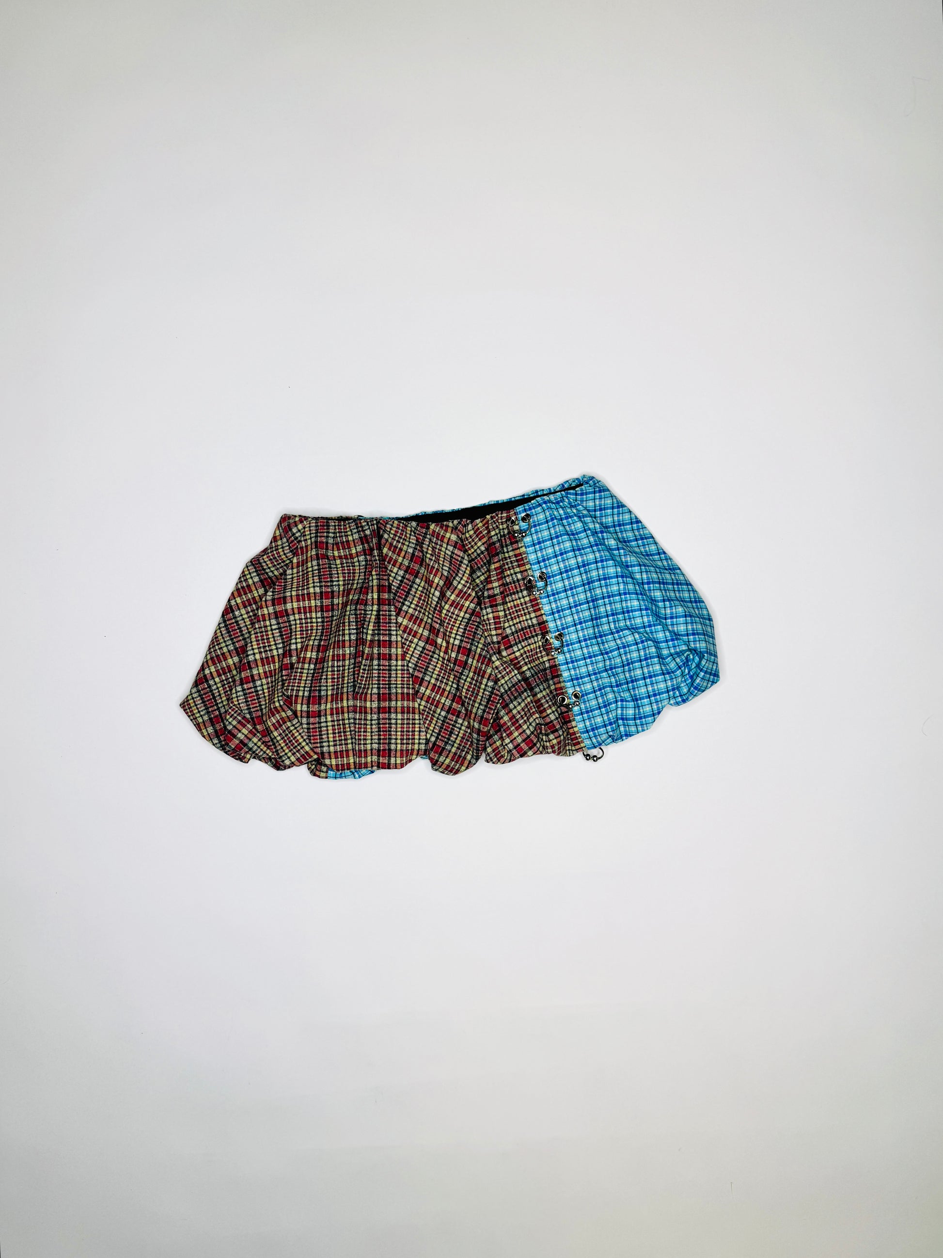 One-of-a-kind low rise bubble skirt, made from vintage plaid fabric. Fully lined with a pull on, elastic waistband. Will fit size S-L.