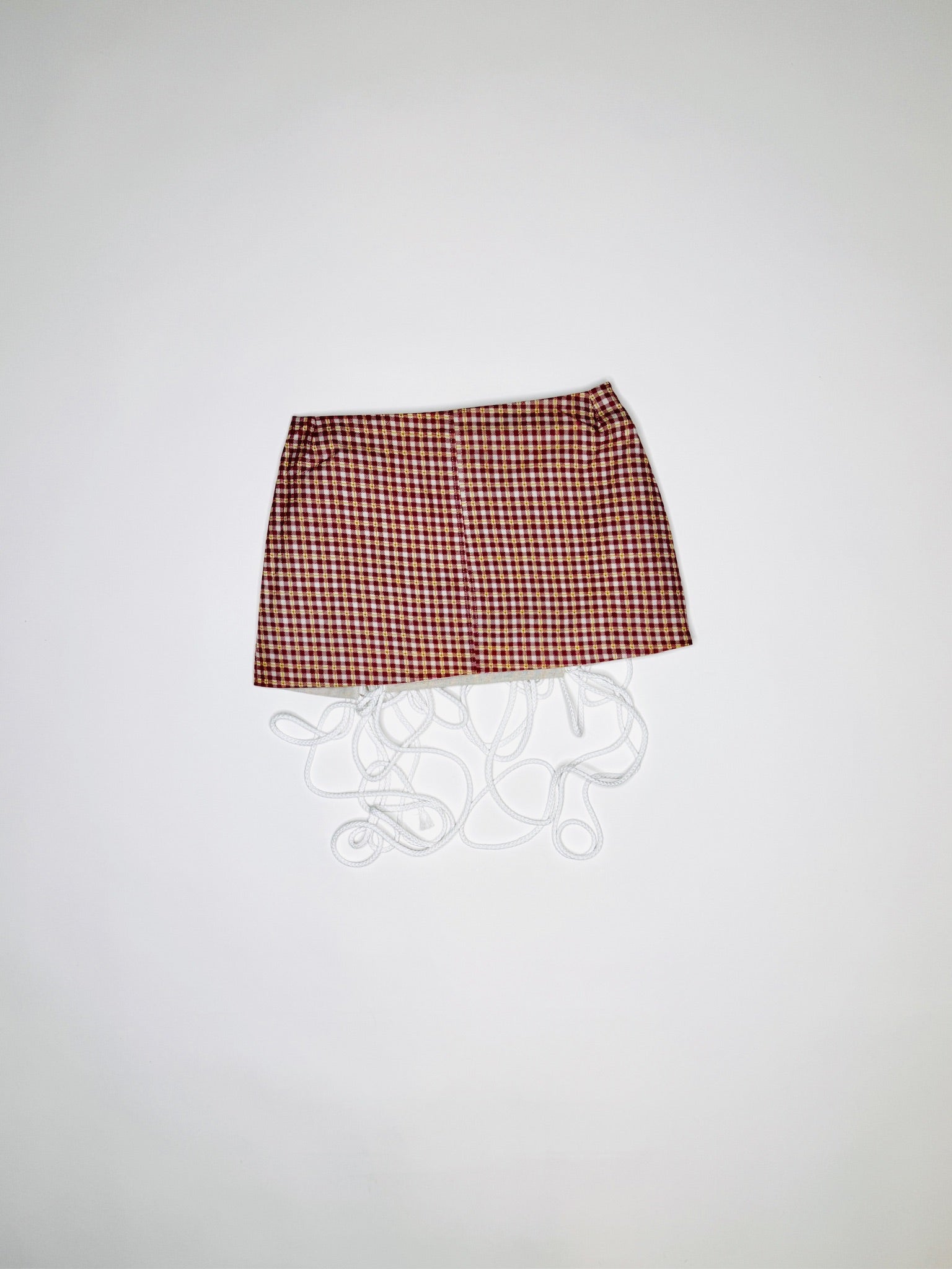 One-of-a-kind red and white gingham skirt. Double front lace-up ribbon closure adjustable from sizes XS - Medium.