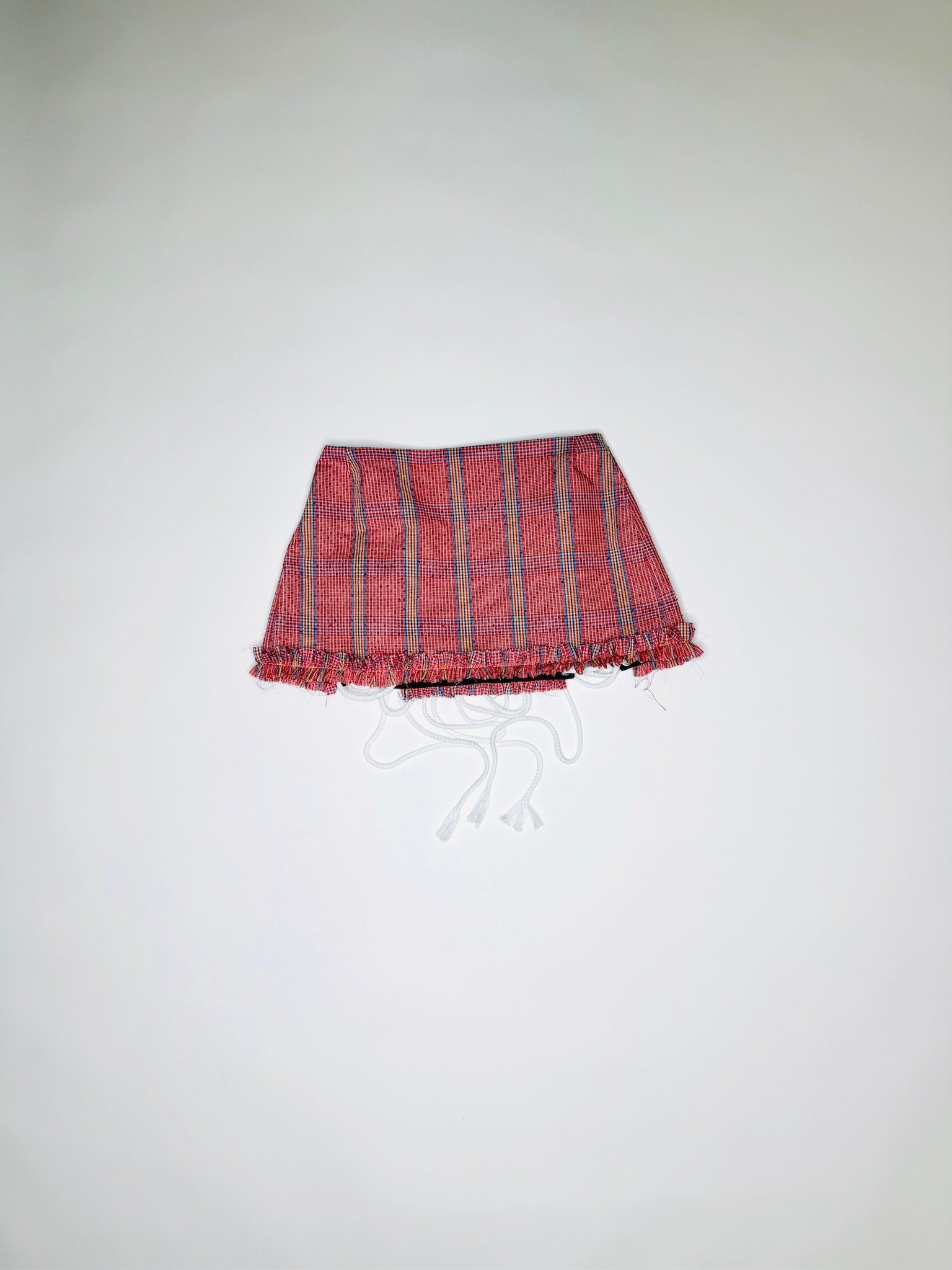 One-of-a-kind Red plaid print skirt. Double front lace-up rope closure adjustable from sizes XS - Medium.