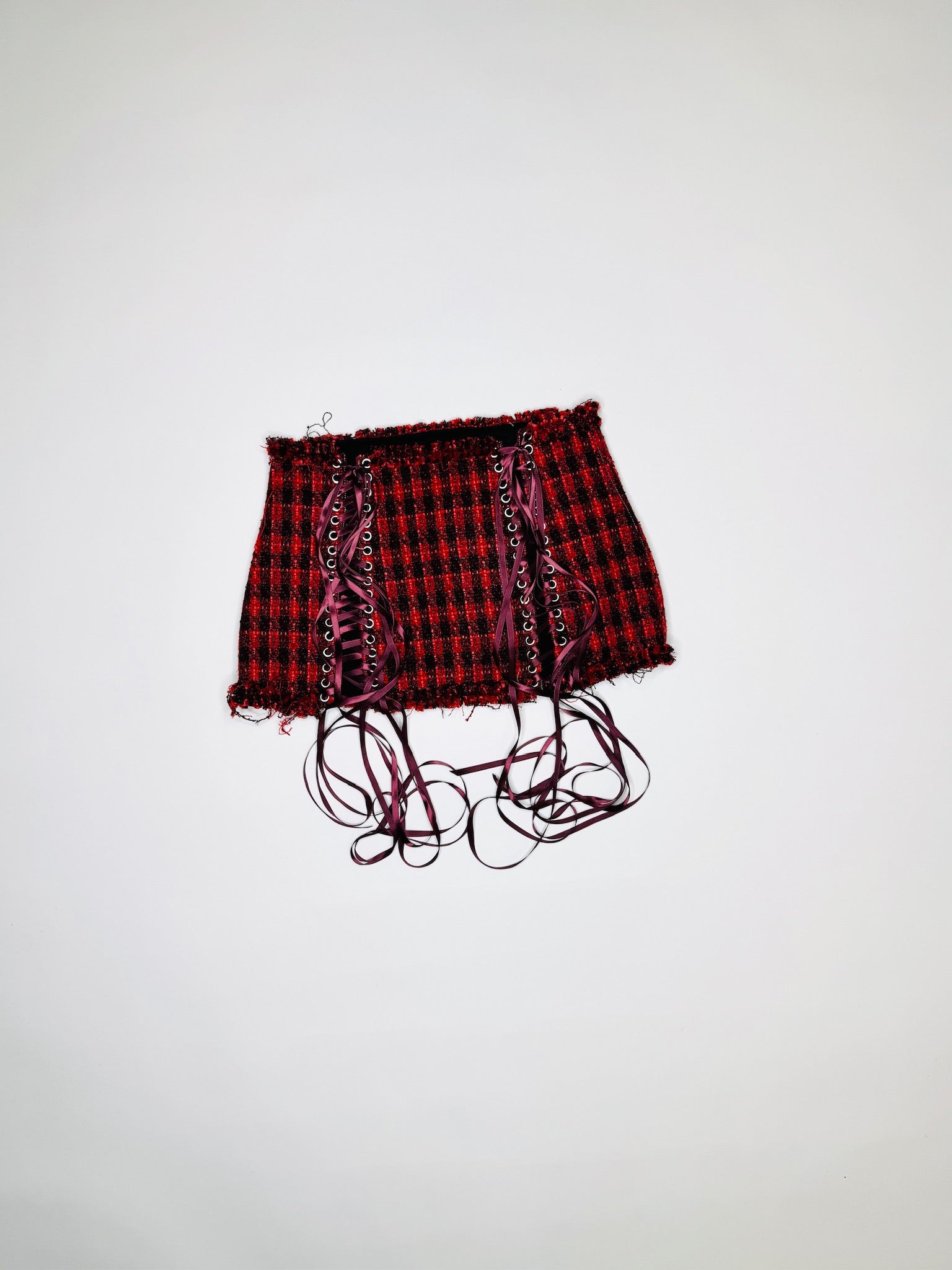 One-of-a-kind Red plaid print skirt. Double front lace-up ribbon closure adjustable from sizes XS - Medium.