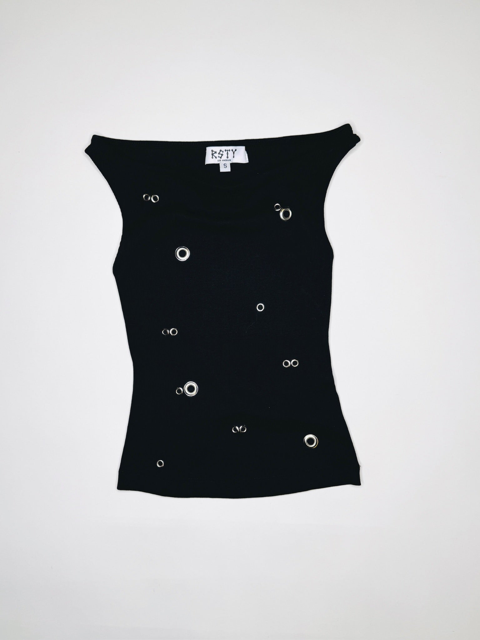 One-of-a-kind pierced black Boatneck Top. Size S.