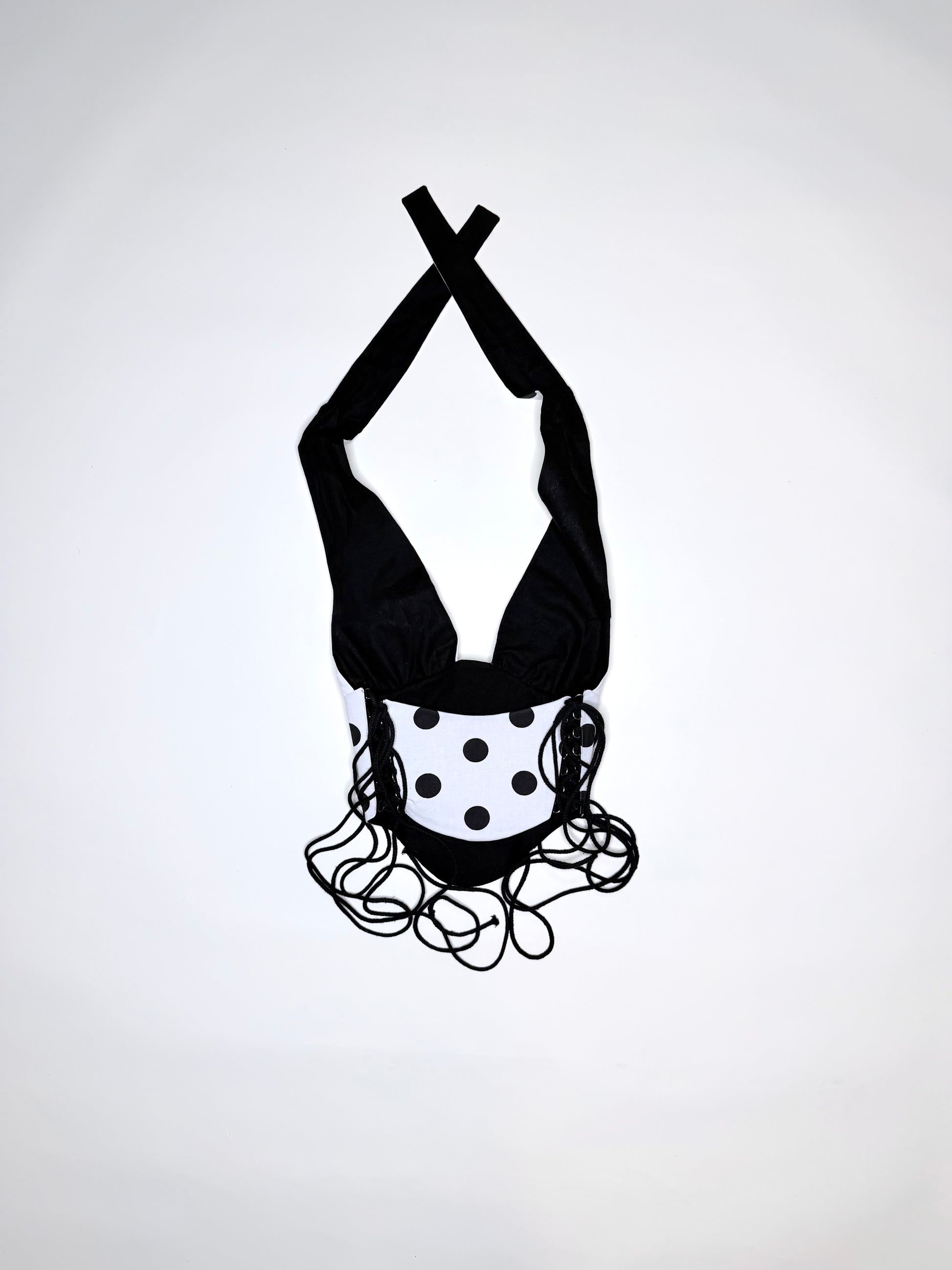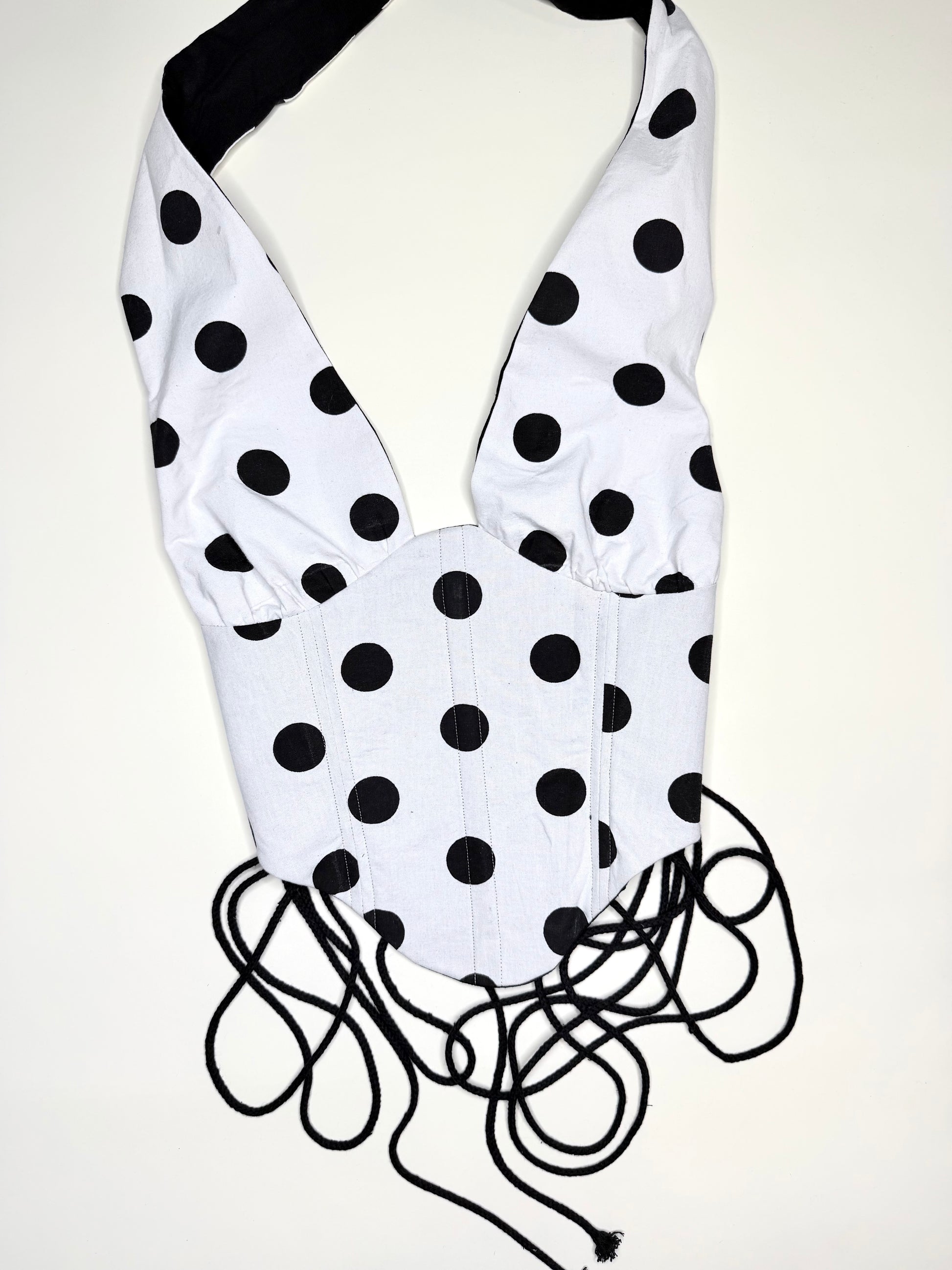 One-of-a-kind white and black polka dot print halter corset. Made with an adjustable halter neck and side lace-up closures from sizes XS - Medium.