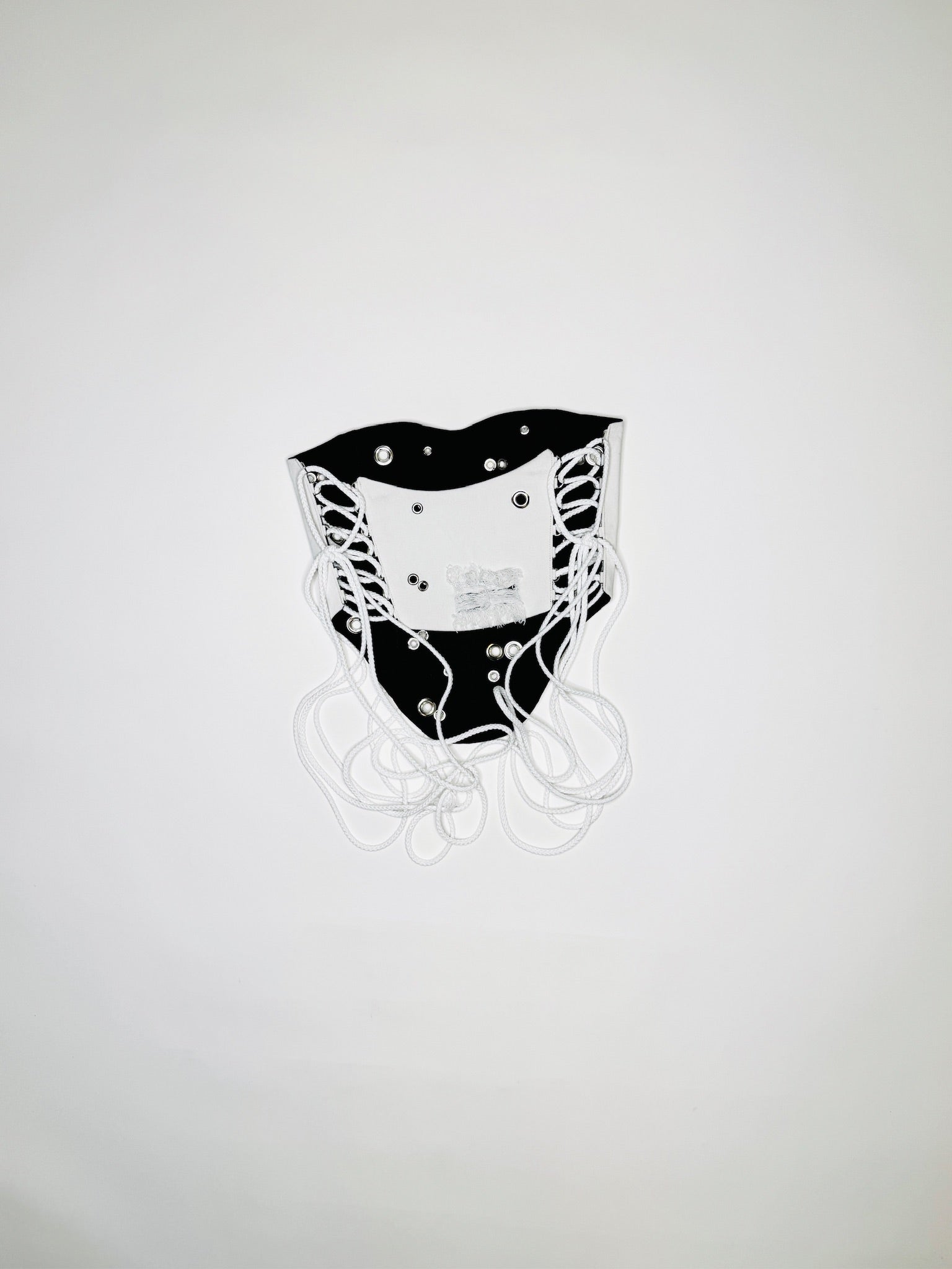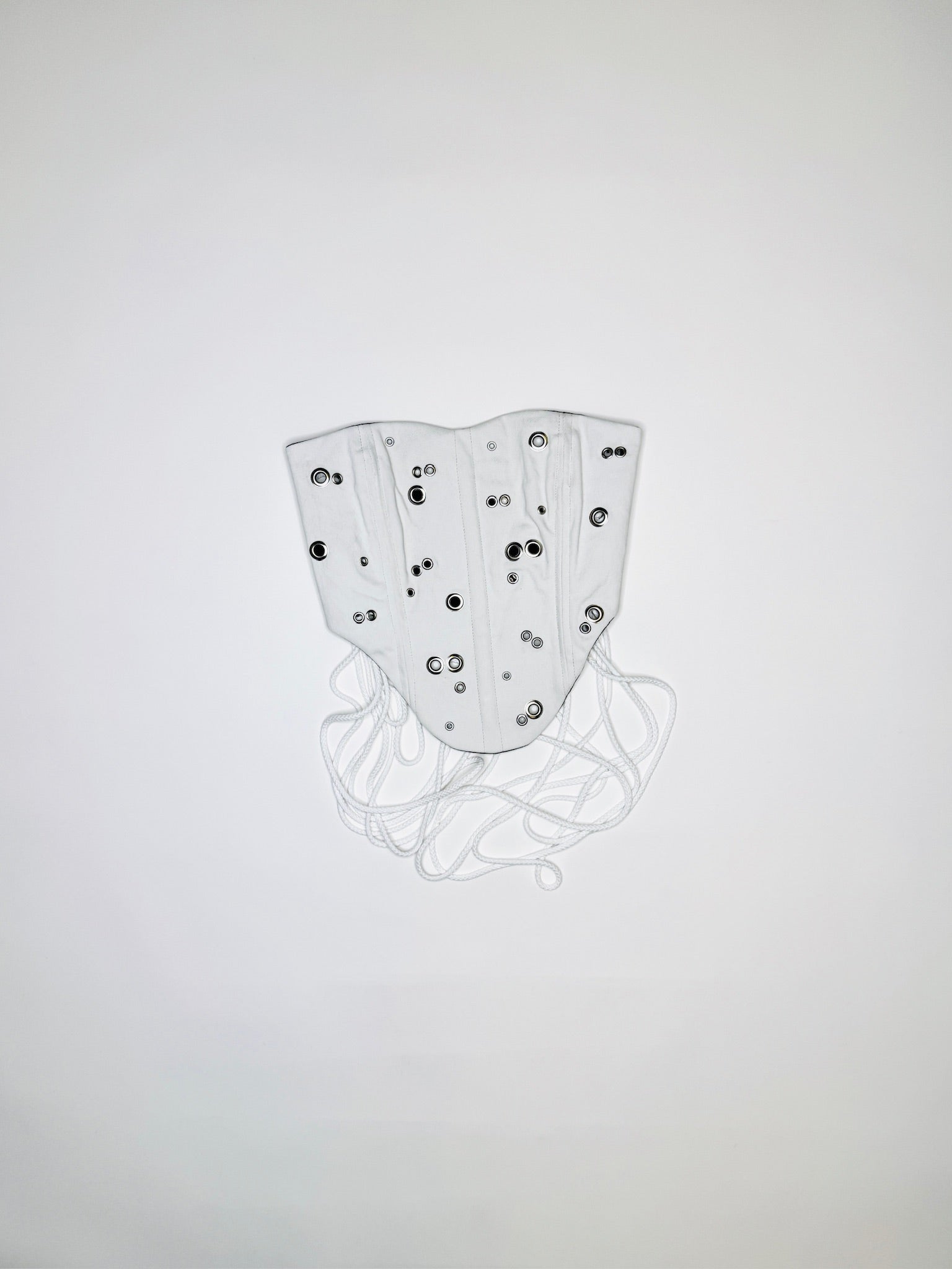 One-of-a-kind pierced white denim corset. Handmade with 100% Linen lining. Side lace-up rope closures adjustable from sizes XS - Medium.