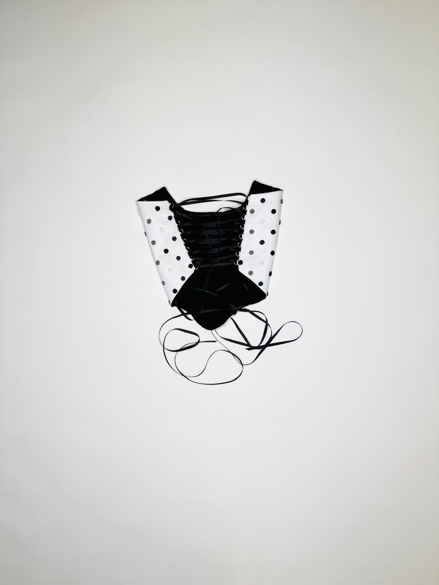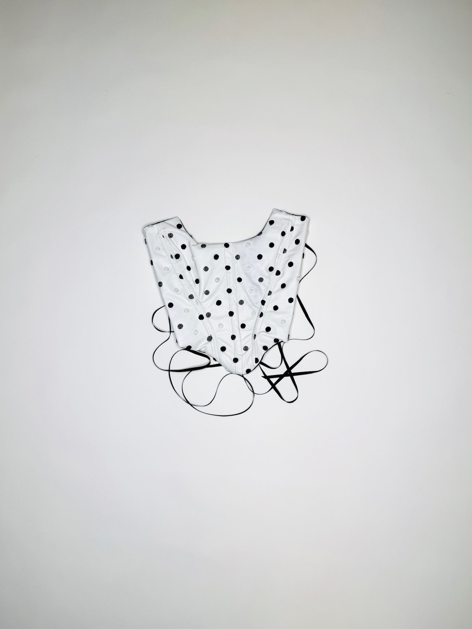 One-of-a-kind white pleather polka dot print corset. Handmade with 100% Linen lining. Back lace-up ribbon closures adjustable from sizes XS - Medium.
